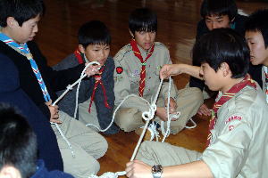 連続的に作る方法を知らないスカウトは、一個ずつ長いロープで結び目を作っていく。 |